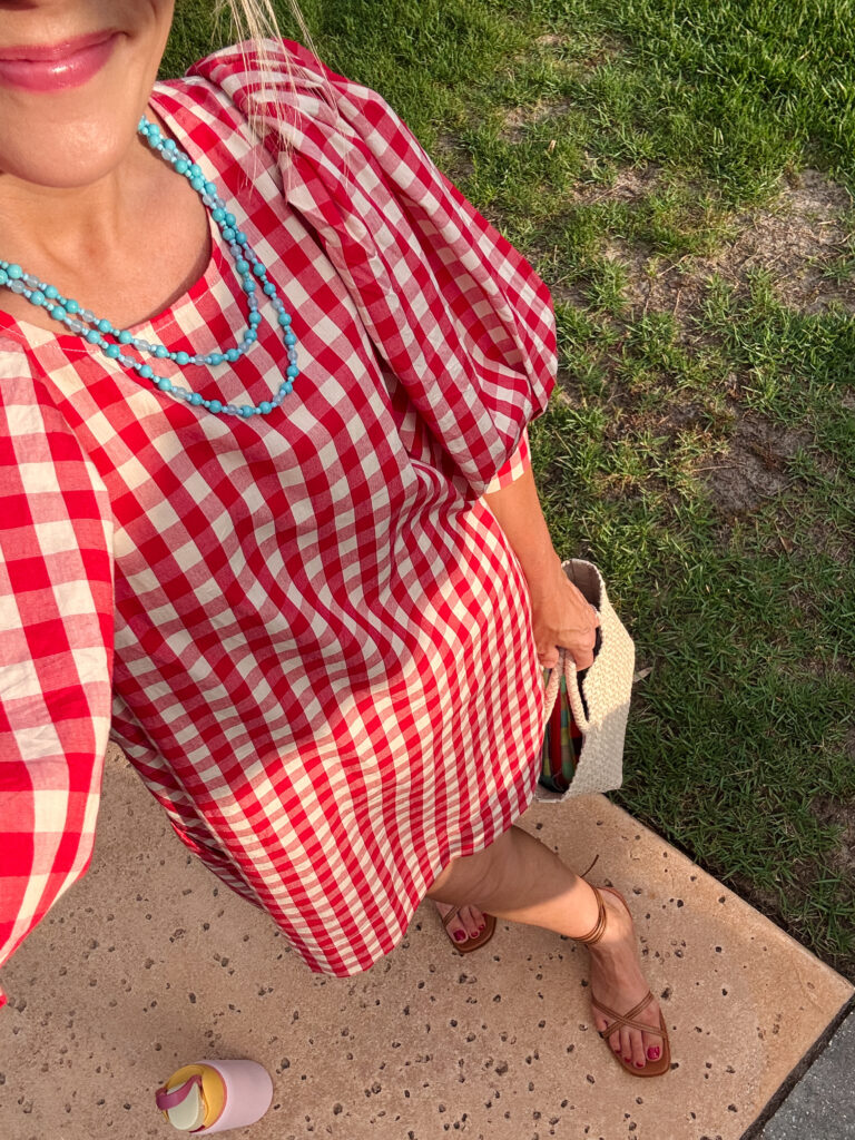 SANDALS true to size : BAG : DRESS wearing a 4 : NECKLACE 20% off this week : MERIT FLUSH BALM on lips in color LeBonBon