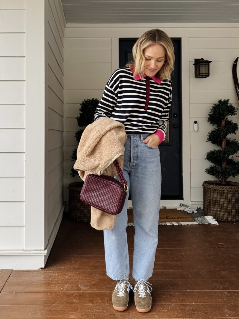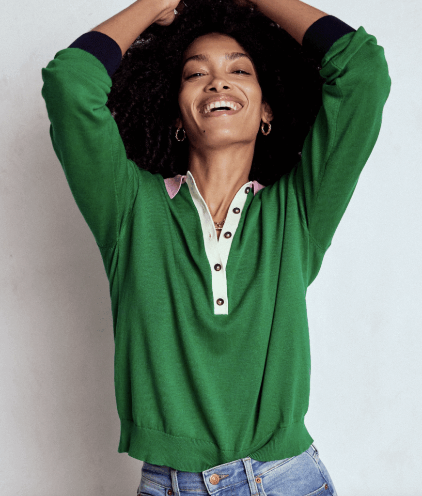 BODEN HENLEY TOP ~ 100% cotton and could not love the contrasting color details more, adds just the right amount of unexpected to a classic style. Wearing my regular size small, also available in green