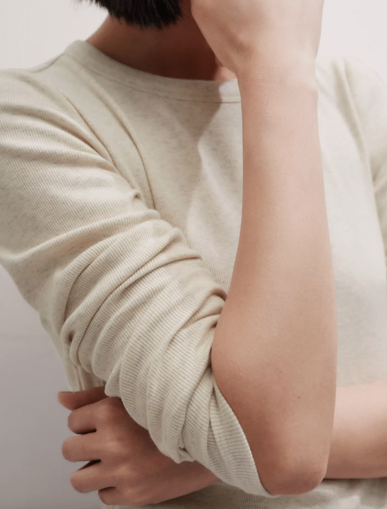 ME&EM LONG PERFECT BASIC TOP ~ my favorite layering long sleeve but the quality is so good it can easily be worn on it’s own, wearing my regular size 4 and find all the colors here (mine is cream melange)