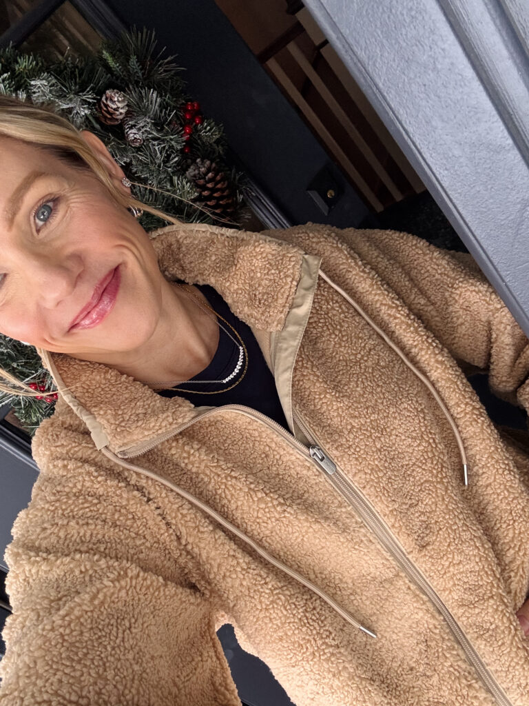 ATHLETA IN THE CLOUDS JACKET ~ now 50% off and a great last minute gift idea, throw these socks in too. Wearing my regular size small (not petite) in color sahara. I also tried this on in the store and it immediately came home with me, sized down to an xs