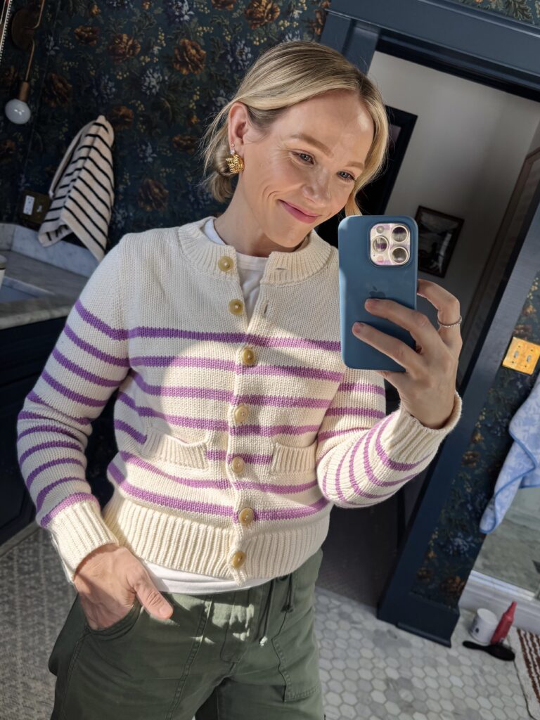 BODEN LUCY COTTON CARDIGAN ~ a classic with stunning soft purple stripes and beautiful button details, wearing my regular size but it is a closer fit so size up for more room. Also own & love the crewneck style worn in this outfit and this adorable top just arrived and is a massive YES, fits tts.